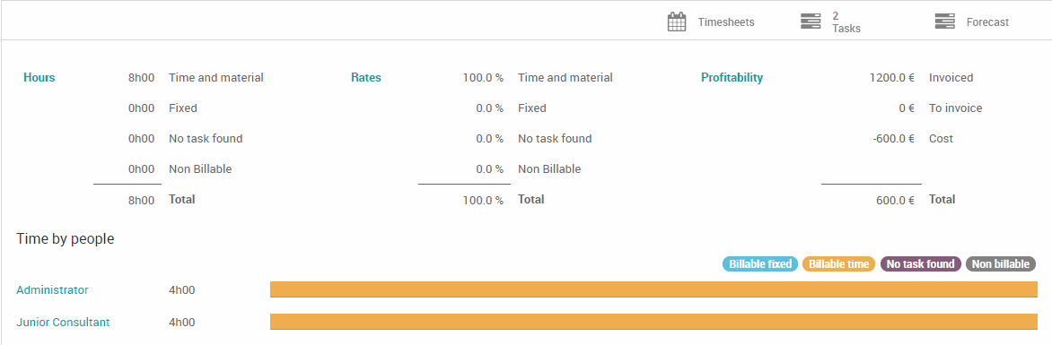With Odoo 11, we have added one extra element to this rich list of services: the ability to analyze the profitability of your employees and projects at a glance in a convenient report. Based on your invoicing methods, you will get attached to each project a detailed analysis of the costs and revenues of all your fixed and billable products as well as the number of your non-billable tasks.